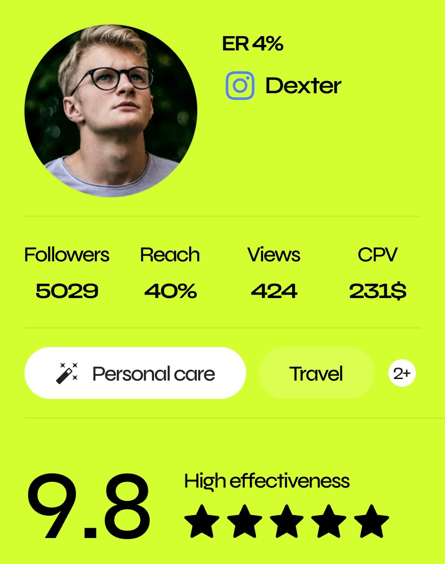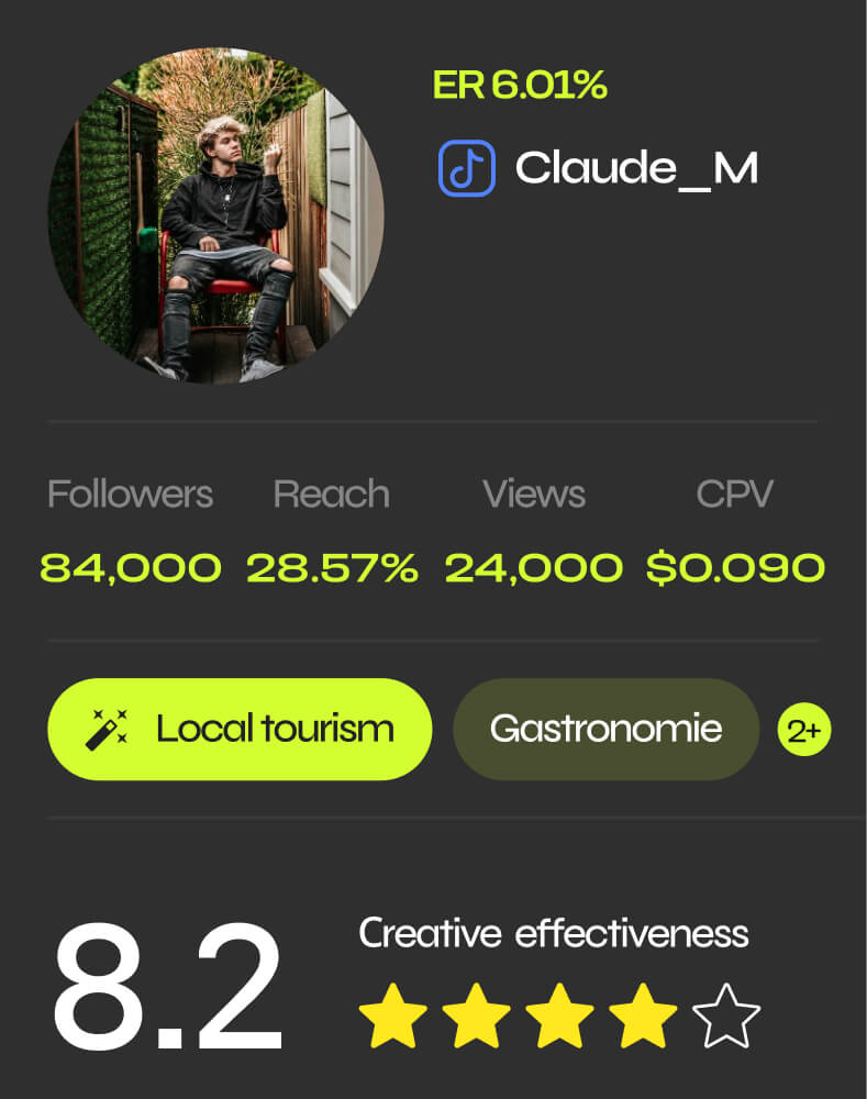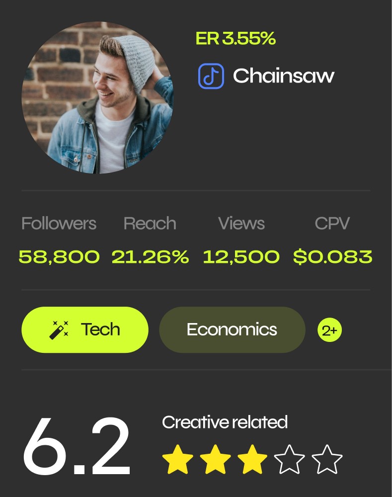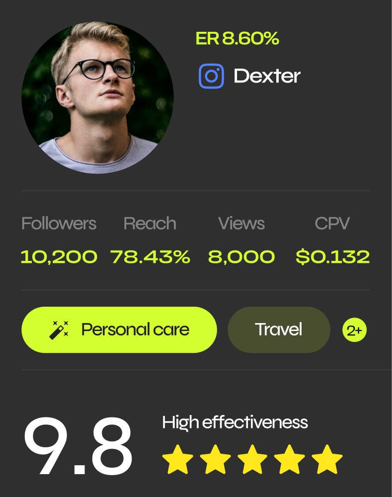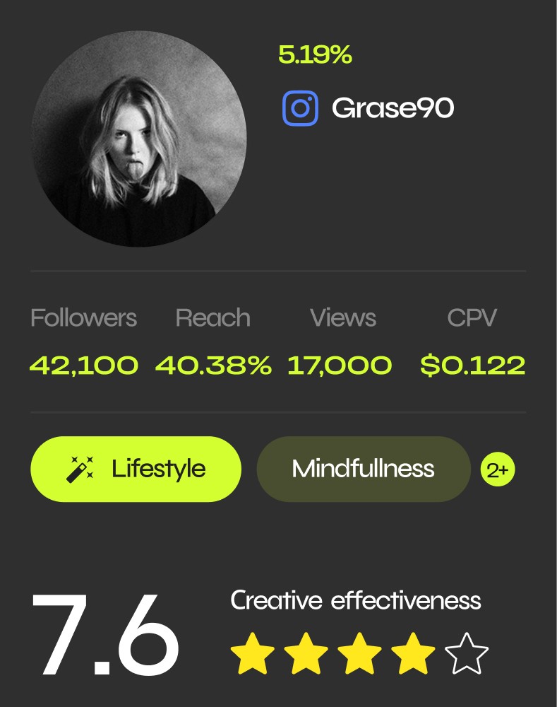 Unique creators effectiveness evaluation AI-scoring based on multiple knowledge sources - your brand historical performance data and extensive global creators base with both real-time quantitate and AI-gathered qualitative metrics.