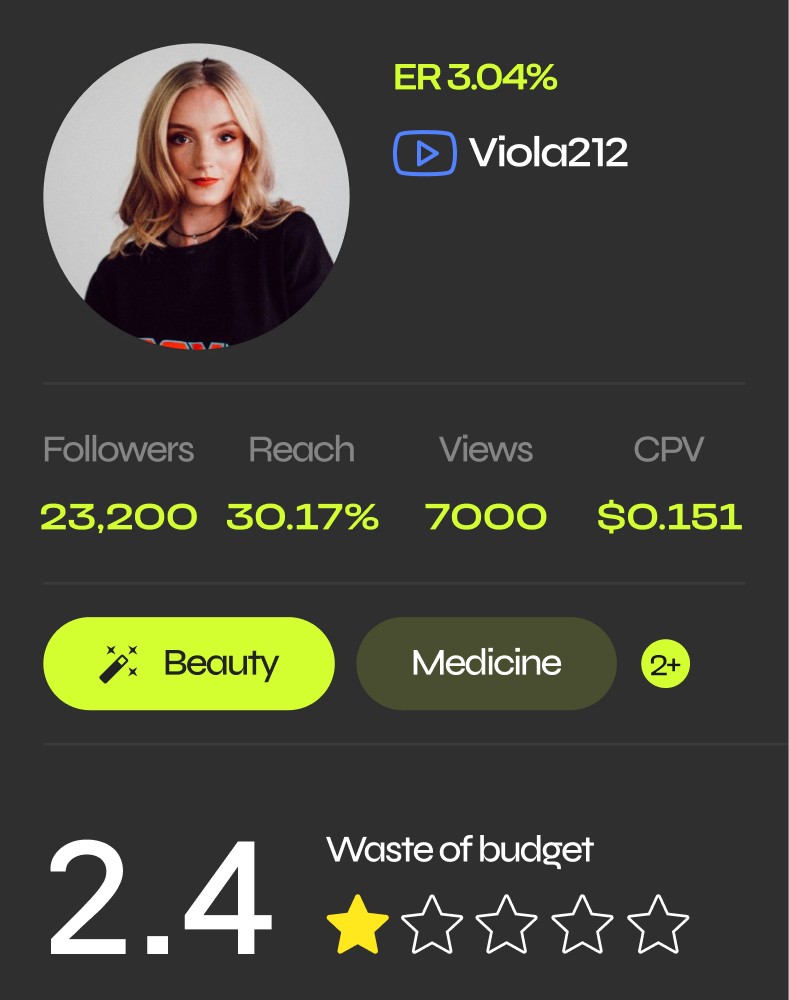 We train AI model to score influencers from 0.00 to 10.00 with performance prediction according to business goals on marketing funnel.